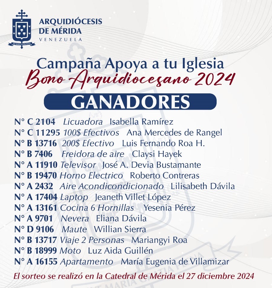 “También queremos agradecer a todas las personas quienes, con muy buena voluntad, colaboraron con la compra del bono arquidiocesano (…) Ha sido un apoyo formidable el que nos han dado y que hoy se ve reflejado en la entrega de estos premios a ganadores de distintas zonas de nuestra arquidiócesis, lo cual nos llena de mucha satisfacción”, finalizó el arzobispo de Mérida.