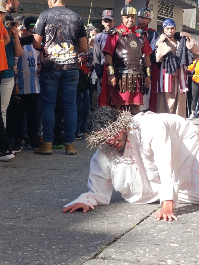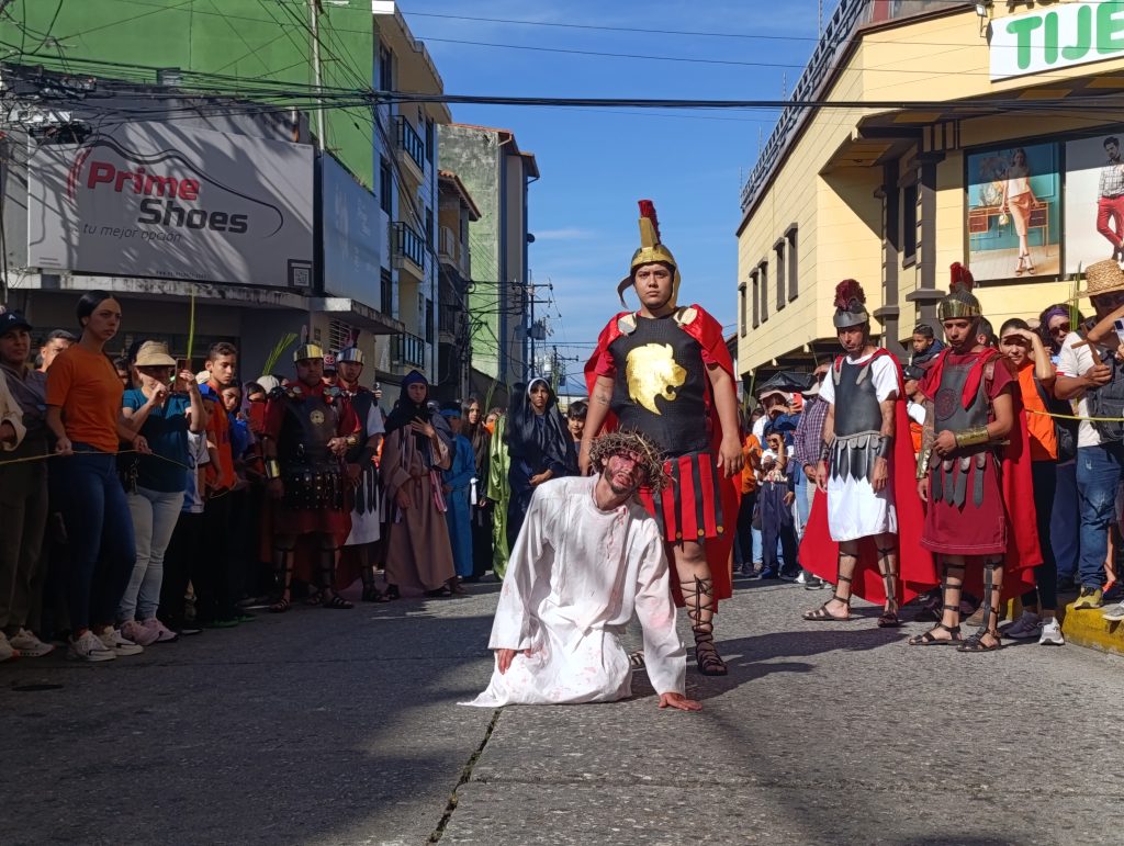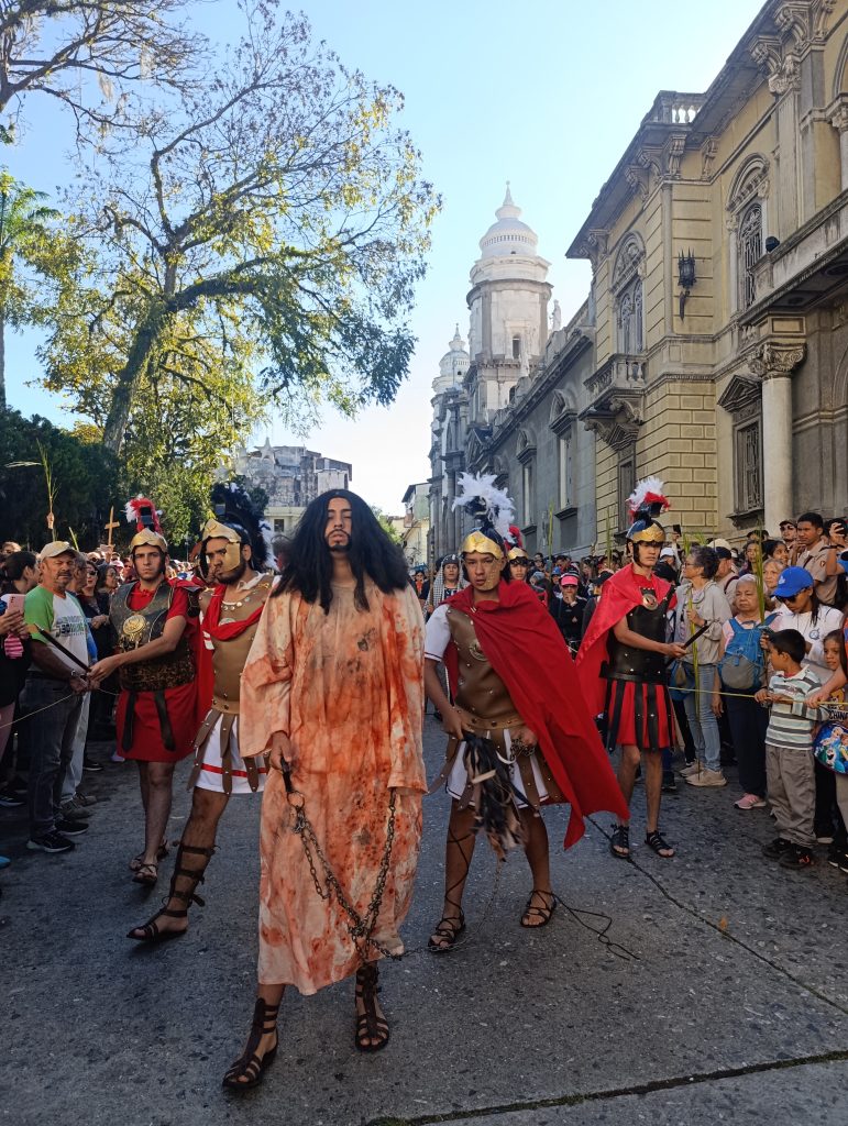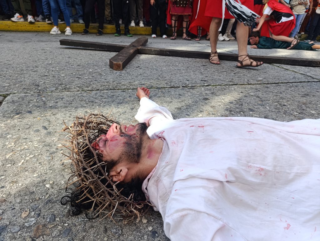 Durante las 14 estaciones que conforman el viacrucis, diferentes grupos de Pasión Viviente de varias parroquias de Mérida y Ejido, escenificaron los pasajes bíblicos que llevaron a Jesús desde su condena frente a Herodes y Pilatos hasta su muerte en la cruz.