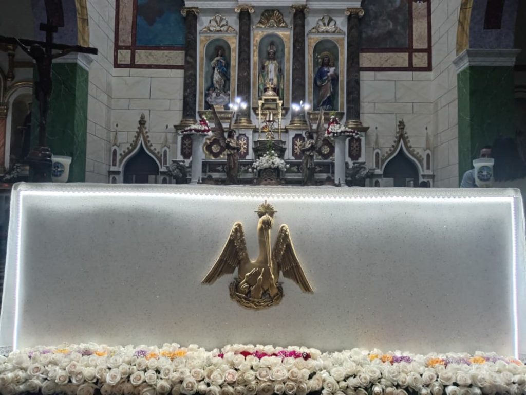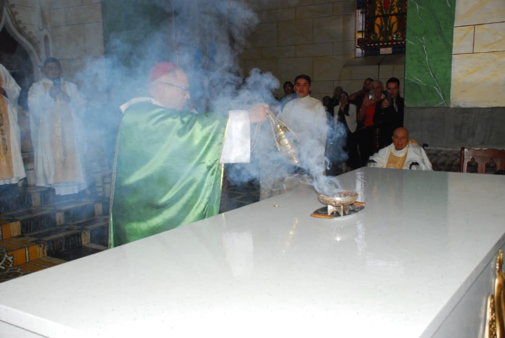 Posteriormente, el altar fue ungido con el santo crisma, incensado como signo de veneración, revestido con los manteles y adornado con luces y flores, recordando que el altar es a la vez lugar del sacrificio y mesa del banquete eucarístico, donde el pueblo de Dios se alimenta del Cuerpo y la Sangre del Señor.
